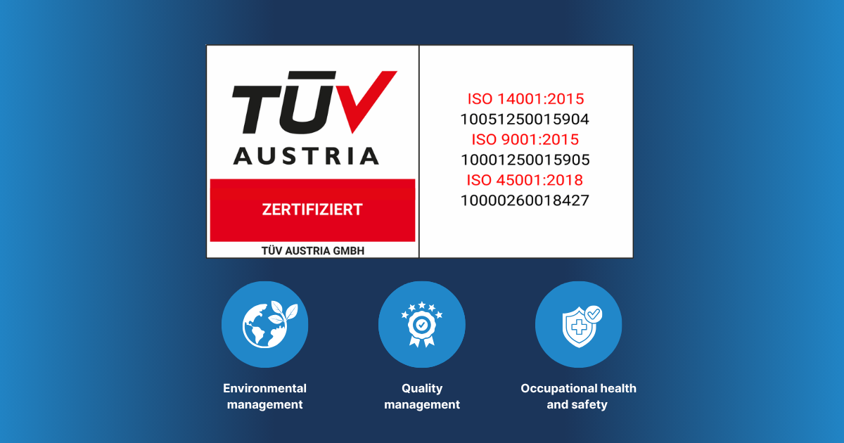 As a brand of Preworks GmbH, SmartArena stands for the highest standards in quality, environmental awareness, and occupational safety. Both Preworks GmbH and Ecoworld LCL GmbH have implemented an integrated management system and are successfully certified according to internationally recognized standards. The certification was issued by TÜV Austria and covers the following standards: